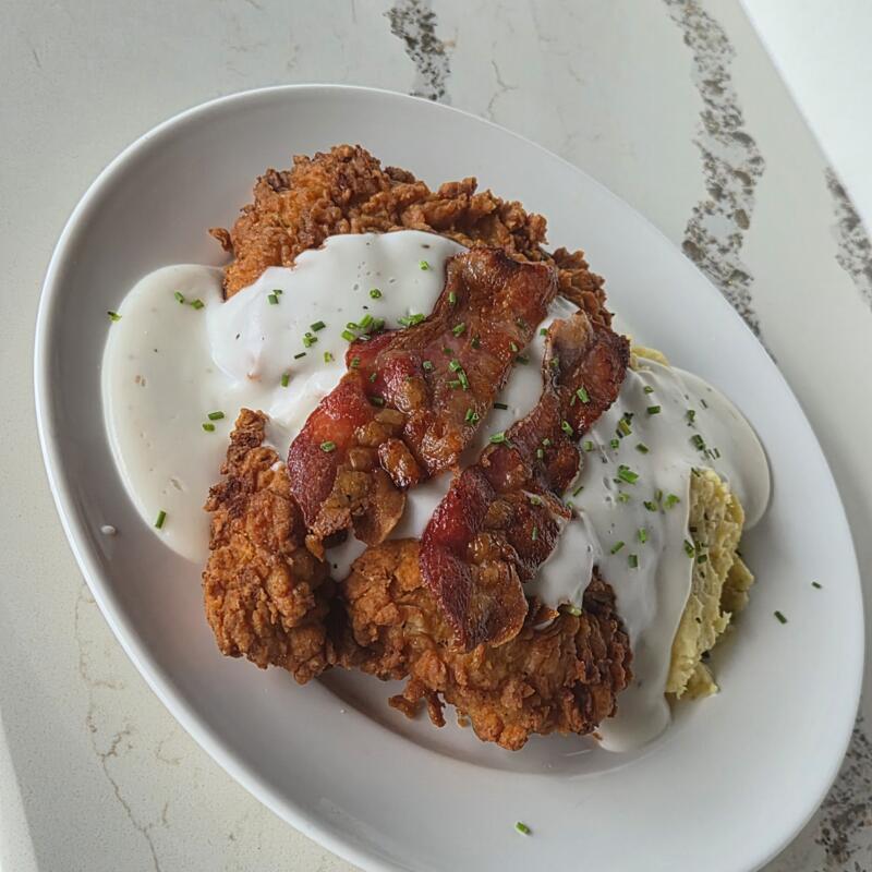 Hang Off the Plate Buttermilk Fried Chicken Breast Topped with Country Gravy and Bacon.